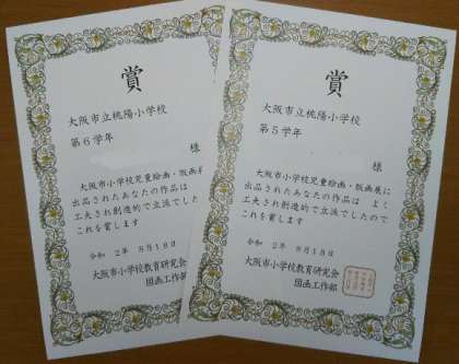 児童朝会で、夏休みにあった大阪市児童絵画版画展に出品した子どもに、賞状を渡しました。