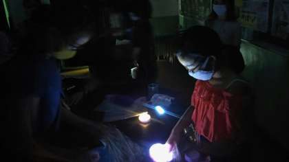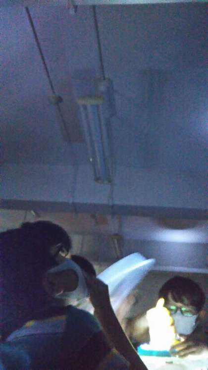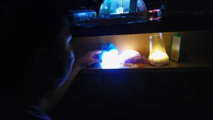 暗幕で光を遮った理科室で、光源となる明かりとその光を通すいろいろな素材を使って、光の映り方を試し、場所の雰囲気を変えてみました。
