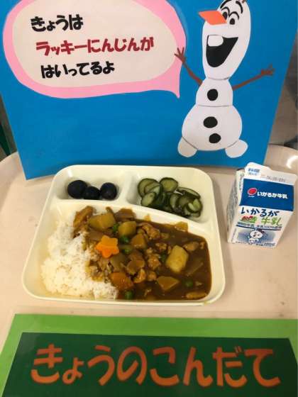 【今日の給食】 ●チキンカレーライス(米粉) ●きゅうりのピクルス ●巨峰 ●牛乳