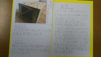 この子は、他にも段ボールで「コロコロスマートボール」や「クルクルスロット」などの楽しいゲームなどをつくっていて、そのことを冊子にまとめました。