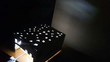 夜の校長室で、試してみました。写真がうまく取れていませんが、とてもきれいでした。一番下の写真は、箱を通った明かりが天井に映っている様子です。