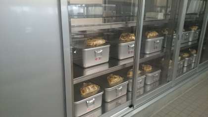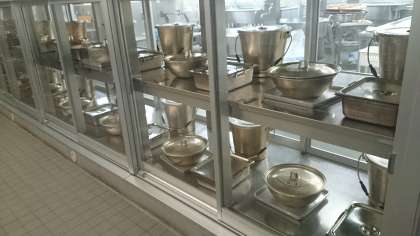 子どもたちが、給食室に来る時間を見計らって、14クラスの給食が、きれいに並べられています。各料理に応じた適切な熱さ、あったかさ、冷たさです。
