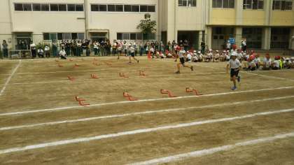 3年生のリレーは、ミニハードルやジグザグ走、フープくぐりなどをクリアーしてリングバトンをつなぐリレーでした。みんなフットワークよく走っていました。