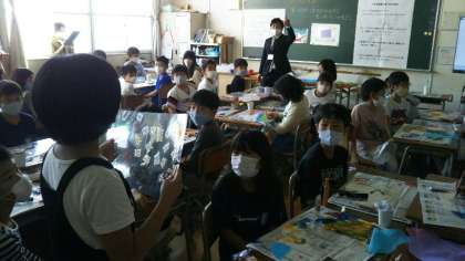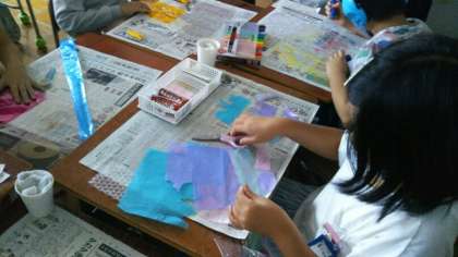 4年生が、透明なシートにお花紙やスズランテープなど、光を通す材料を使って絵に表す活動をしました。