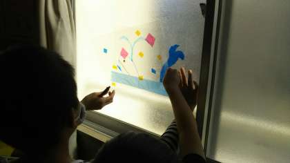 光を通す材料を重ね、組み合わせることで、新しく生まれる色や光を通した時の絵の見え方を楽しみながら、表していました。