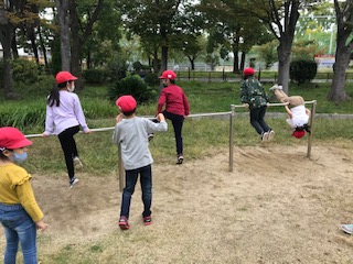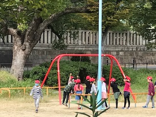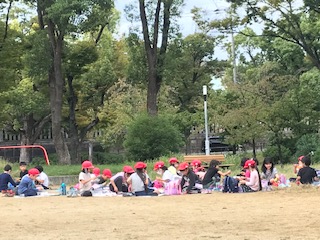 今日は、午後から雨の予報も出ていましたので、少し早めの出発をしました。30分ほど歩き、生玉公園に着きました。今日は、秋とは思えない暑さで、遊具や縄跳び、かけっこなど子どもたちは汗だくであそびました。そして、昼にはお楽しみのお弁当。体をよく動かしたのでとてもお腹がすいたともりもり食べました。そして、食後は、おやつも楽しみました。その後、もう少し遊びました。学校へ帰ってきた門の前で少し雨がパラっときて、とてもいいタイミングで帰ってくることができました。集合したときに、みんなが今日はたのしかったぁと話していました。