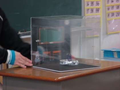 手作りの「透明な小さな教室の模型(写真下)」に線香の煙を充満させ、窓とドアを開けると換気できる様子を実験した時は、教室に歓声があがりました。