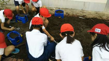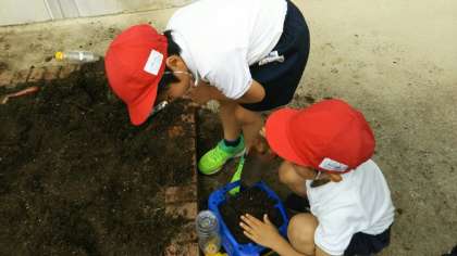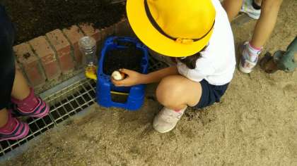 1年生が、1学期に育てたアサガオの鉢植えを使って、チューリップの球根を植えました。