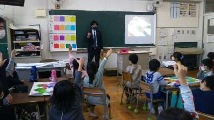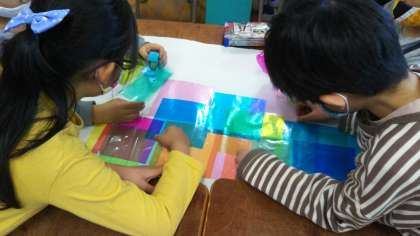 2年生図画工作で、透明折紙や色セロハンを重ねてできる形や色を鑑賞する学習をしました。
