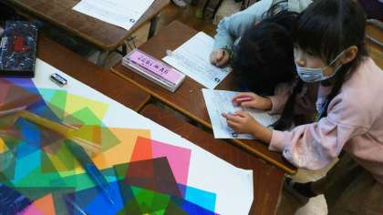 子どもたちは、透明なシートが重なってできる形や色を楽しんでいました。また、自分なりに感じたことを鑑賞カードに書く活動を通して、造形的な見方、感じ方を働かせていました。