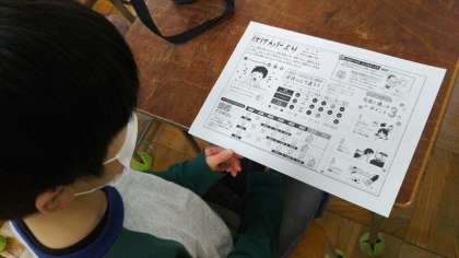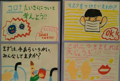 子どもたちが、描いた感染症予防のポスターを貼っているクラスがありました。子どもたちに感染予防の意識を持たせるのによい方法だと思います。