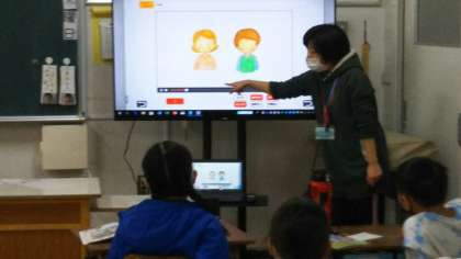自分の名前を言ったり、「友だちになりましょう。」と呼びかけたりする言い方を学習していました。