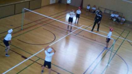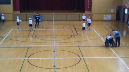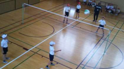 5年生が、ソフトバレーボールを基にした、ネットを挟んでボールをやり取りするゲームに取り組んでいました。
