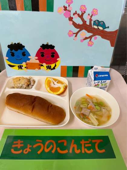 【今日の給食】 ●押し麦のグラタン ●スープ ●いよかん ●黒糖パン ●牛乳