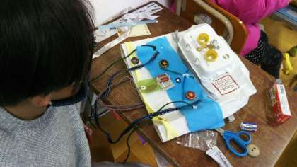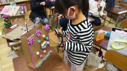 紙の袋に、折紙や色画用紙のテープでつくった飾りを接着して、世界にひとつしかないオリジナルバッグをつくっています。家から持ってきた生活身辺材料も使いながら、子どもたちの発想が、どんどん広がっていきます。