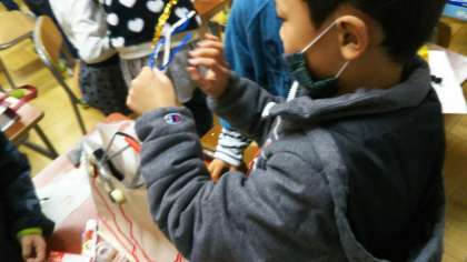 1年生が、図画工作で「かざって なに いれよう」という題材に取り組んでいます。