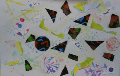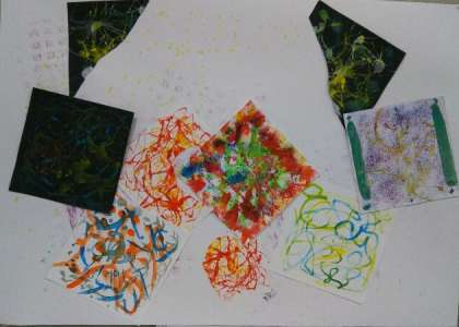 色をたくさん使い、いろいろな技法をためしてみました。絵の具を水をつけずに描いてみたり、指を使って描いてみたりしました。描いた絵の気持ちを考え破いてみました。