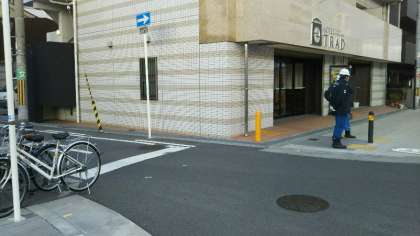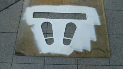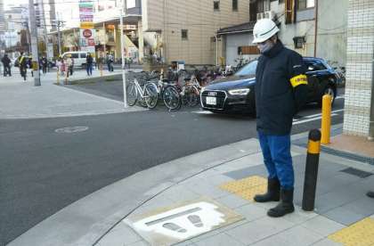 そこで、大阪市建設局田島工営所の方にお願いして、子どもたちが一旦停止を意識できるように足形をかいてもらうことにしました。