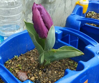 1年生が昨年植えたチューリップの球根に、早くも花弁をふくらませ始めたものがあります。