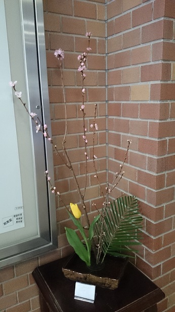 チューリップが桃に「そろそろ、花を開こうか」と話しかけているようです。