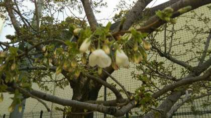 桃陽小学校に唯一あるサクラ(山桜)が開花しました。5〜6輪咲いているので開花宣言をしてもよいと思います。
