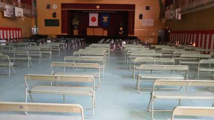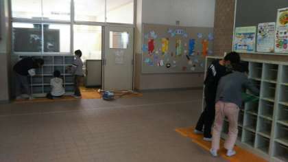 明日の卒業式に向けて、5年生の児童が式場や玄関などの設営や清掃をしてくれました。どの子も進んで仕事をし、あっという間に準備が整いました。