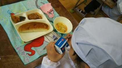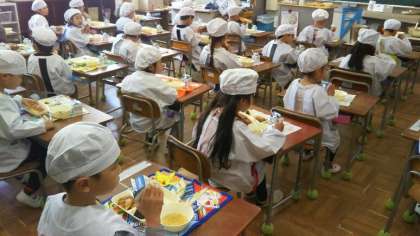 一昨日入学したばかりの1年生、さっそく今日から給食が始まりました。