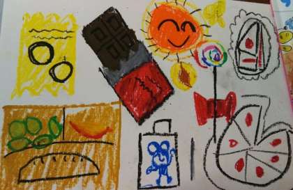 1年生が、図画工作の学習でパスを使って「自分の描きたいもの」を描いていました。
