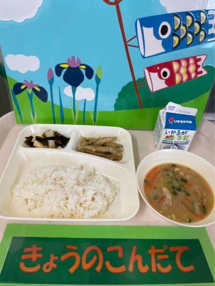 【今日の給食】 ●きびなごのてんぷら ●豚汁 ●わかたけ煮 ●ごはん ●牛乳