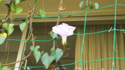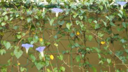 昨年花壇をつくり、琉球アサガオやゴーヤなどを植えました。昨年植えた琉球アサガオのつるを残しておいたら、今年も葉を広げはじめ、先週末からは花を咲かせ始めました。