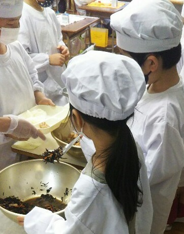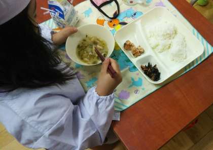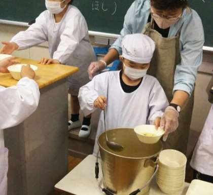 1年生が、給食の用意をしています。担任の先生や教職員にサポートしてもらいながらですが、少しずつできるようになってきています。