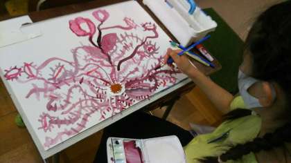 絵の具をマーブリング状に混ぜ合わせ、できた形を「ふしぎなたね」に見立て、そのたねから想像して「ふしぎな花」を描くという題材です。