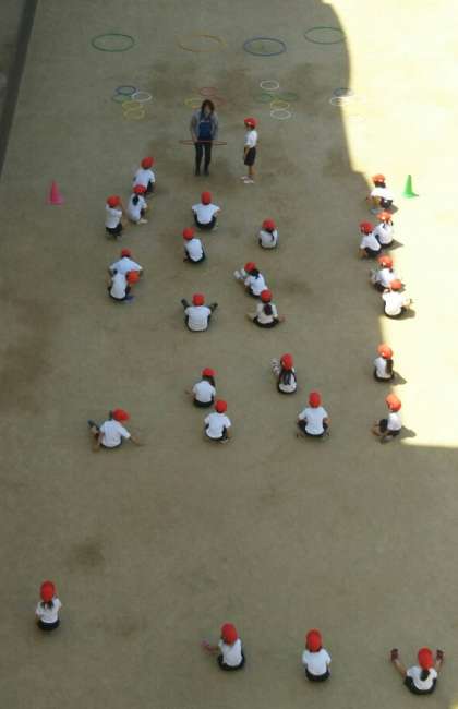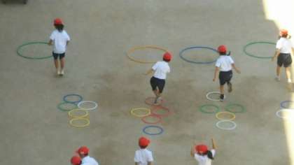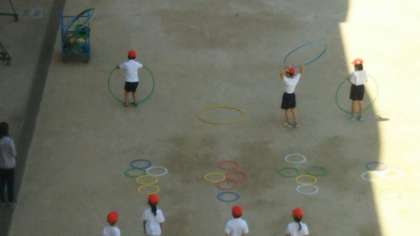 WBGT指数(暑さ指数)に注意しながら、日陰で活動したり水分補給をしたりしながら体育の学習を進めています。