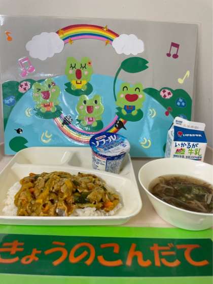 【今日の給食】 ●和風カレー丼 ●もずくとオクラのとろり汁 ●ヨーグルト ●牛乳
