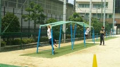 1年生が体育の時間に、「うんてい」の端から端まで行けるかチャレンジしていました。