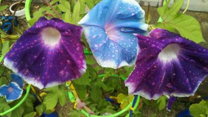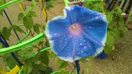 明け方まで降っていた雨が滴になって、今朝開いたアサガオの花にのっていました。