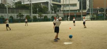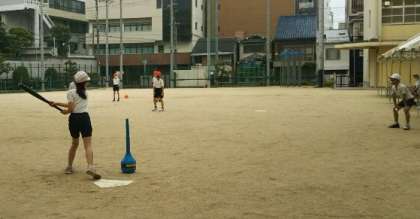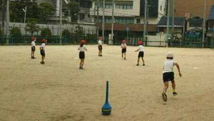 4年生が、体育でティーボールというベースボール型のゲームに取り組んでいました。