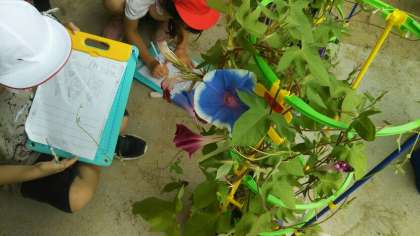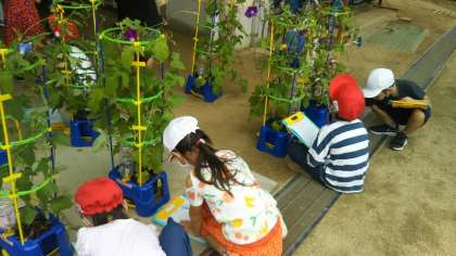 子どもたちが、咲いたアサガオの花の観察記録を書いていました。
