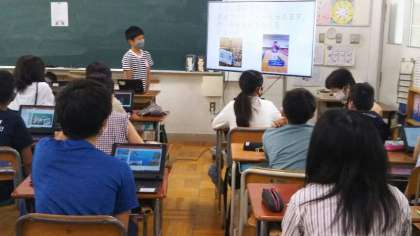 6年生が、自分の興味のあるテーマについて調べ、パワーポイントでプレゼンテーションをつくり、学級の友だちに紹介していました。