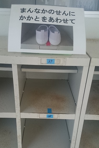 ユニバーサルデザインの考え方を取り入れた取り組みとして、全児童の下駄箱に、ちょっとした工夫をしてみました。