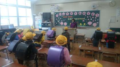 (上)真新しいランドセル。小学校最初の日が終わります。