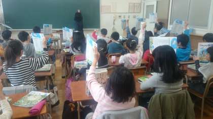 (下)毎日、「今日の一言」を板書する先生。今年も健在です。