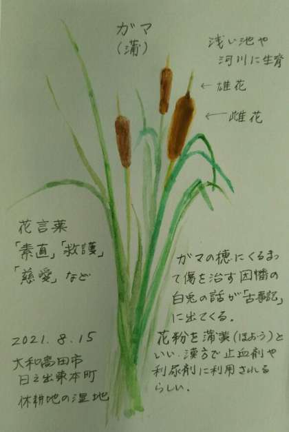 だましたワニザメに毛をむしりとられ苦しんでいるウサギに大国主命(オオクニヌシノミコト)が、「真水で体を洗い、ガマの穂をつけてごらん。」と教えてあげます。ウサギが言われたとおりにすると元の姿にもどることができたそうです。