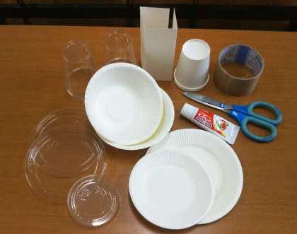 かみざら、かみこっぷ つかいおわったガムテープのしん おかしのはいっていたつつ など