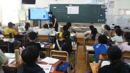 先に実習を始めた学生が、さっそく授業をしていました。担任の先生に指導を受け、デジタル教科書を活用して授業を進めていました。