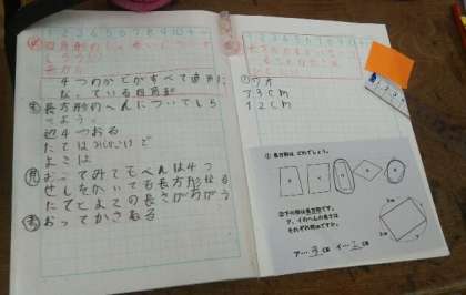 手元で図形(長方形)を操作しながら、「向かい合う辺の長さが等しい」ということに気づきました。