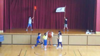 昼休み、2階の体育館から和太鼓の音が聞こえてくるので、のぞきに行ってみると、運動会に向けて応援団が練習をしていました。