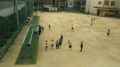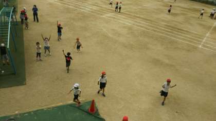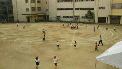 2階体育館から昼休みの運動場の様子を見ていると、気付いた子どもたちが手をふってくれました。