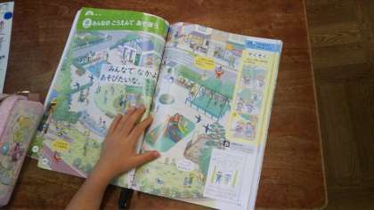 1年生が、生活の学習で夏のようすと秋の様子のちがいについて学習していました。