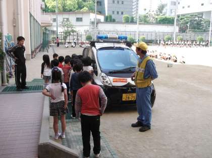 天王寺区役所危機管理課 安全パトロール隊の皆さんによる講話と防犯パトロールカー(青パト)の紹介です。桃陽小学校の通学路の写真や映像をもとに、交通安全や誘拐・連れ去り防止など生命安全を守ることの大切さをわかりやすく説明していただきました。